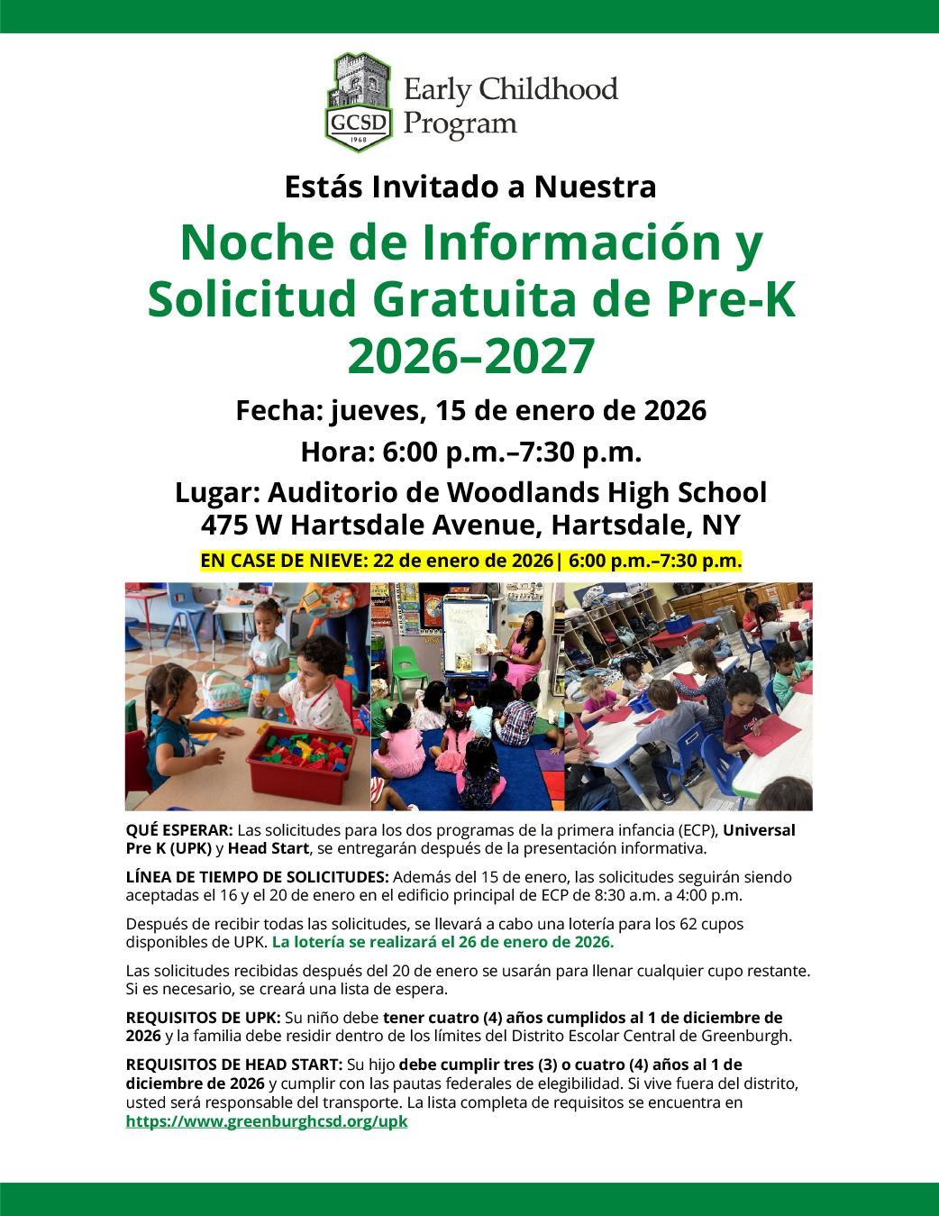Atención familias y comunidad de Greenburgh: ¡Anoten la fecha en sus calendarios para el nuevo año! Están invitados a nuestra Noche Informativa sobre la solicitud de inscripción gratuita al programa preescolar 2026-2027, el jueves 15 de enero de 2026, de 6 p.m. a 7:30 p.m. Vean el folleto para más detalles y visite www.greenburghcsd.org/upk