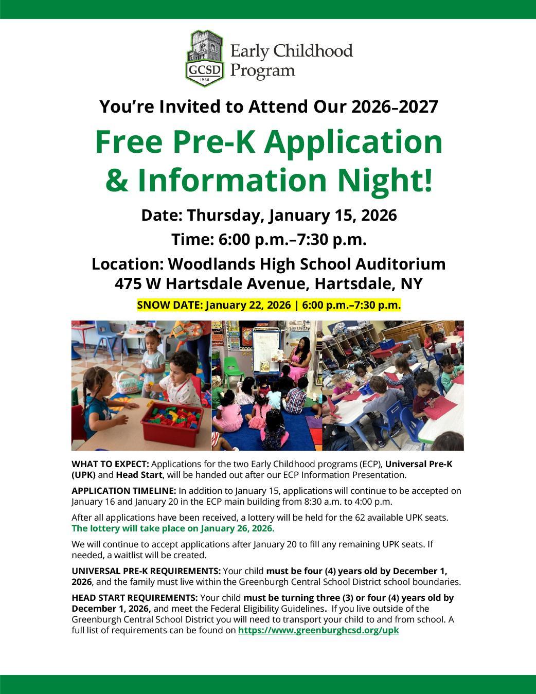Attention Greenburgh Pre-K Families and community: Mark your calendars for the new year! You're invited to attend our 2026-2027 Free Pre-K Application & Information Night on Thursday, January 15, 2026 from 6 p.m. to 7:30 p.m.! See the flyer for more details and visit www.greenburghcsd.org/upk