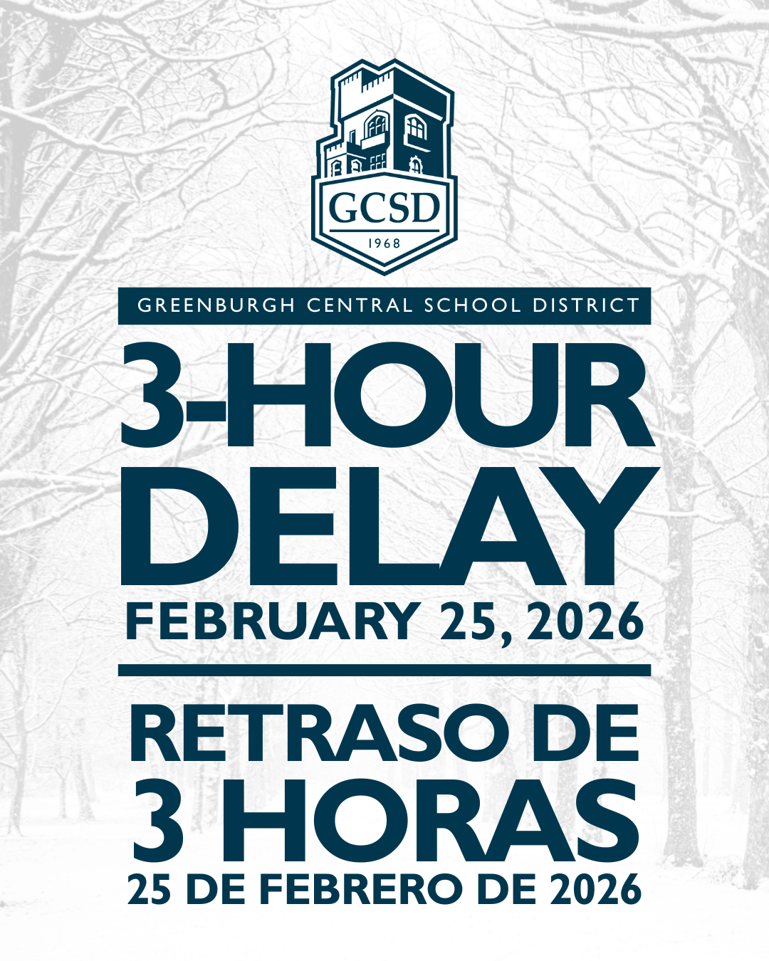 Due to impeding road conditions and transportation safety, Greenburgh Central School District is moving to a three hour delay today, February 25, 2026.