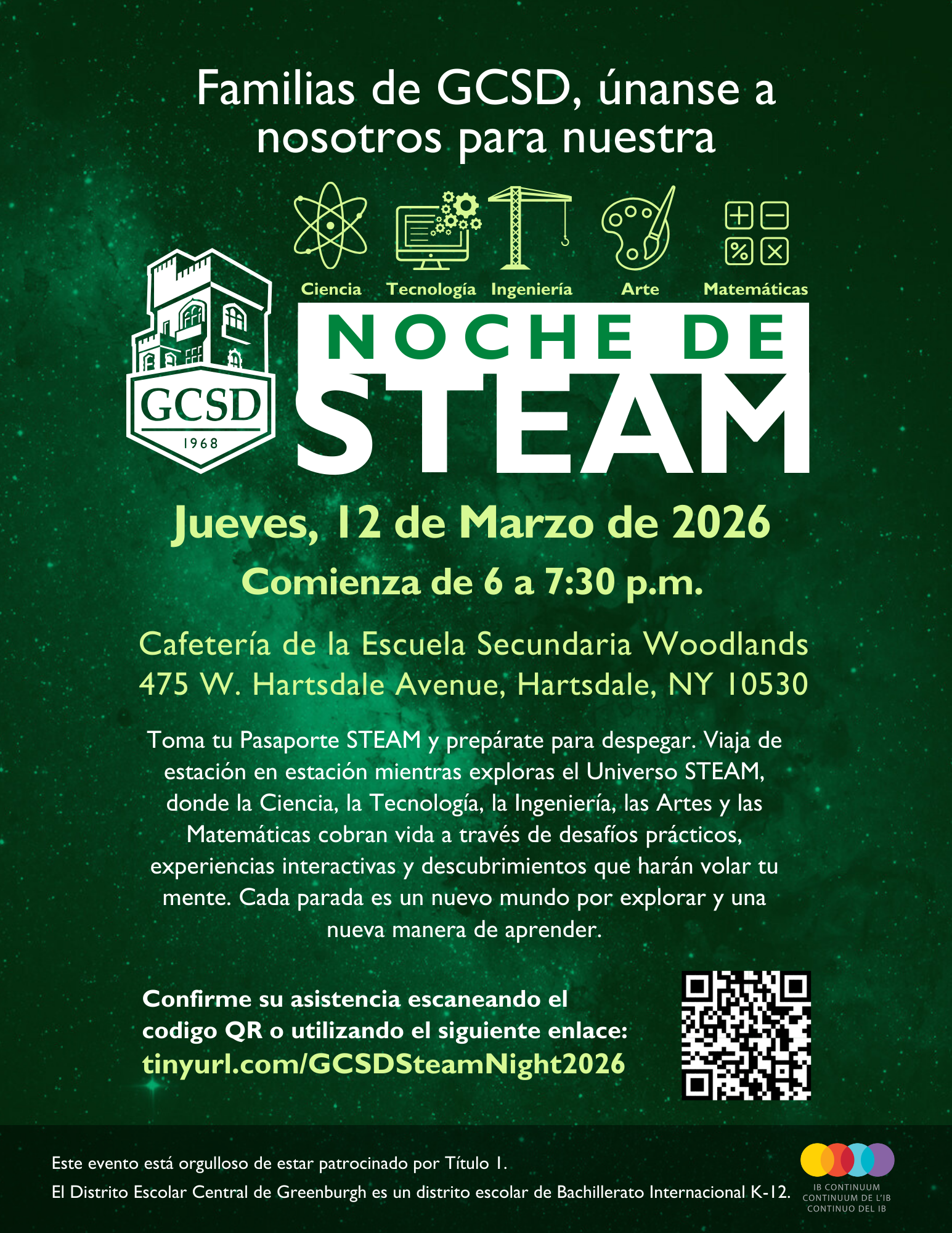 Únase a nosotros para nuestra NOCHE DE STEAM el Jueves 12 de Marzo de 2026, de 6 a 7:30 p.m. ¡En la cafetería de Woodlands Middle High School!