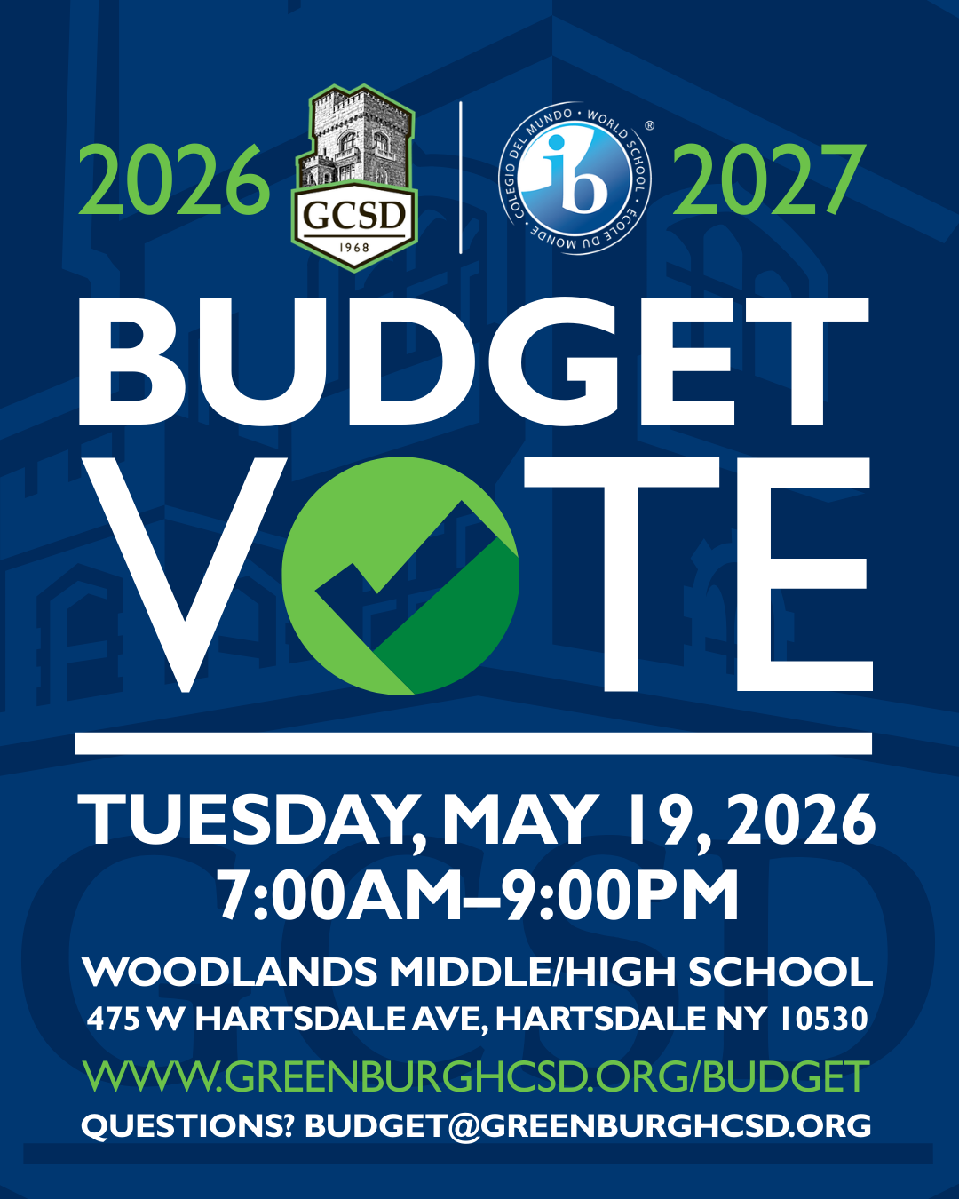 The GCSD 2026-2027 Budget Vote will take place on Tuesday, May 19, 2026, from 7 a.m. to 9 p.m. at the Woodlands Middle/High School Gymnasium.